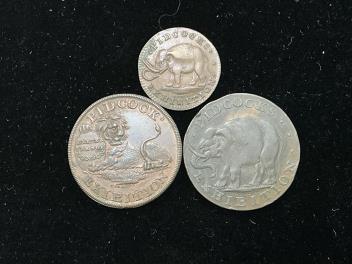 Lot 2148 , 18th century British copper tokens, J & G Pidcock, PIDCOCKs EXIBITION halfpenny, Lion lying, rev. Eagle, DH Middlesex 414, verdigris, otherwise about UNC, PIDCOCKs EXHIBITION, halfpenny, elephant standing, rev. rhinocero