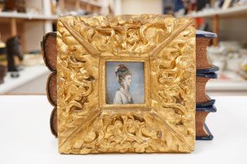 Lot 1675 , 18th century School, Portrait miniature of Jane Fleming, daughter of John Fleming, Bart of Brompton Park married 23rd May 1779, Charles 3rd Earl, watercolour on ivory, inscribed in ink verso, housed in an ornate gilt fra