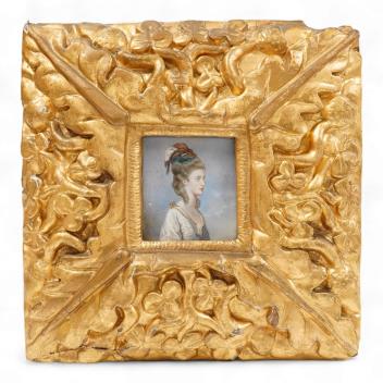 18th century School, Portrait miniature of Jane Fleming, daughter of John Fleming, Bart of Brompton Park married 23rd May 1779, Charles 3rd Earl, watercolour on ivory, inscribed in ink verso, housed in an ornate gilt frame, 5 x 4.5cm CITES Submission reference TTEXX7AQ
