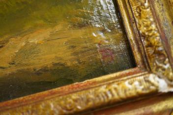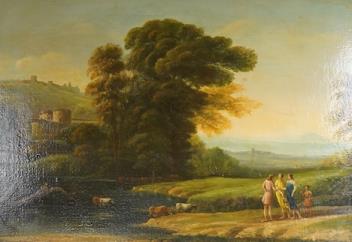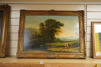 Lot 732 , 18th century style, landscape with figures and cattle watering, contemporary oil on board, 49 x 69cm