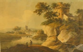 Lot 1737 , 19th century, English School, Figures beneath a stone tower beside a river, watercolour, 39 x 60cm