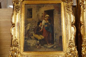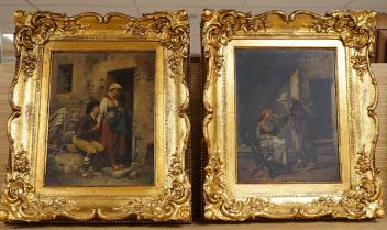 Lot 730 , 19th century, Italian School, Studies of beggars, unsigned, pair of oils on canvas, one inscribed ‘Zempinni’, verso, 29 x 22cm, gilt frames