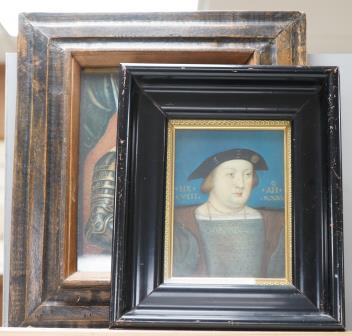 19th century School, Portrait of King Ferdinand III, The Holy Roman Emperor, watercolour on card together with a Portrait of King Henry VIII, After Lucas Horenbout (fl. 1534-44) gouache, largest 24 x 19cm