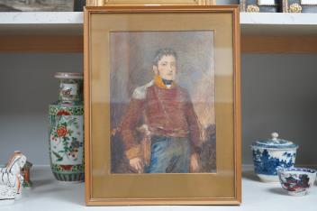 19th century School, Three-quarter length portrait of a gentleman wearing military dress, unsigned, watercolour, together with two other portraits of Victorian gentleman, largest 27 x 20cm, one housed in an ornate gilt frame