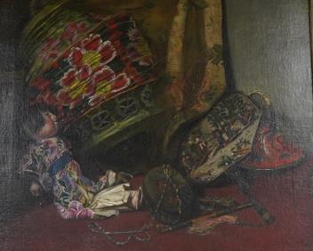 Lot 725 , 20th century, Japanese still life with lantern and doll, unsigned, oil on canvas, 49 x 60cm
