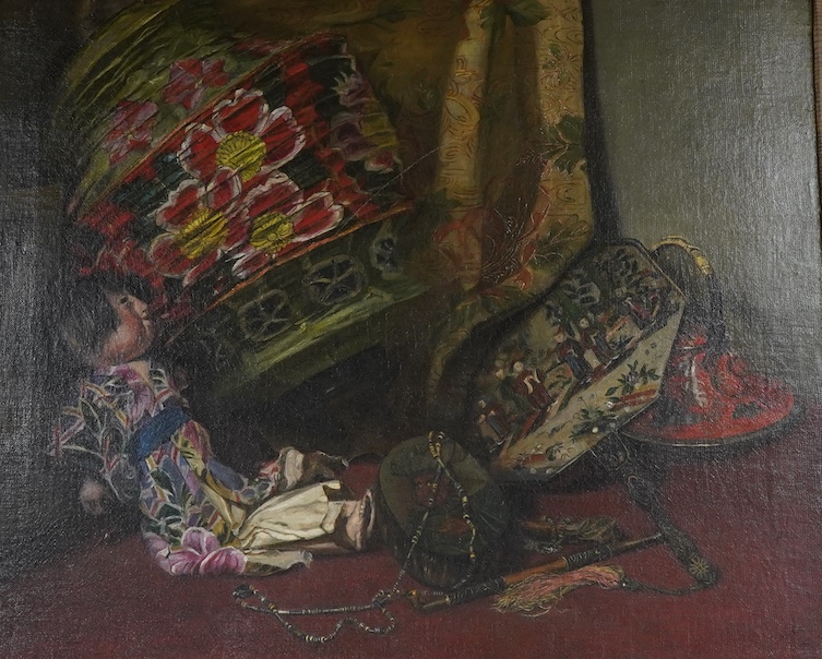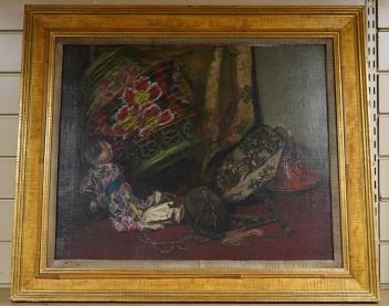 20th century, Japanese still life with lantern and doll, unsigned, oil on canvas, 49 x 60cm