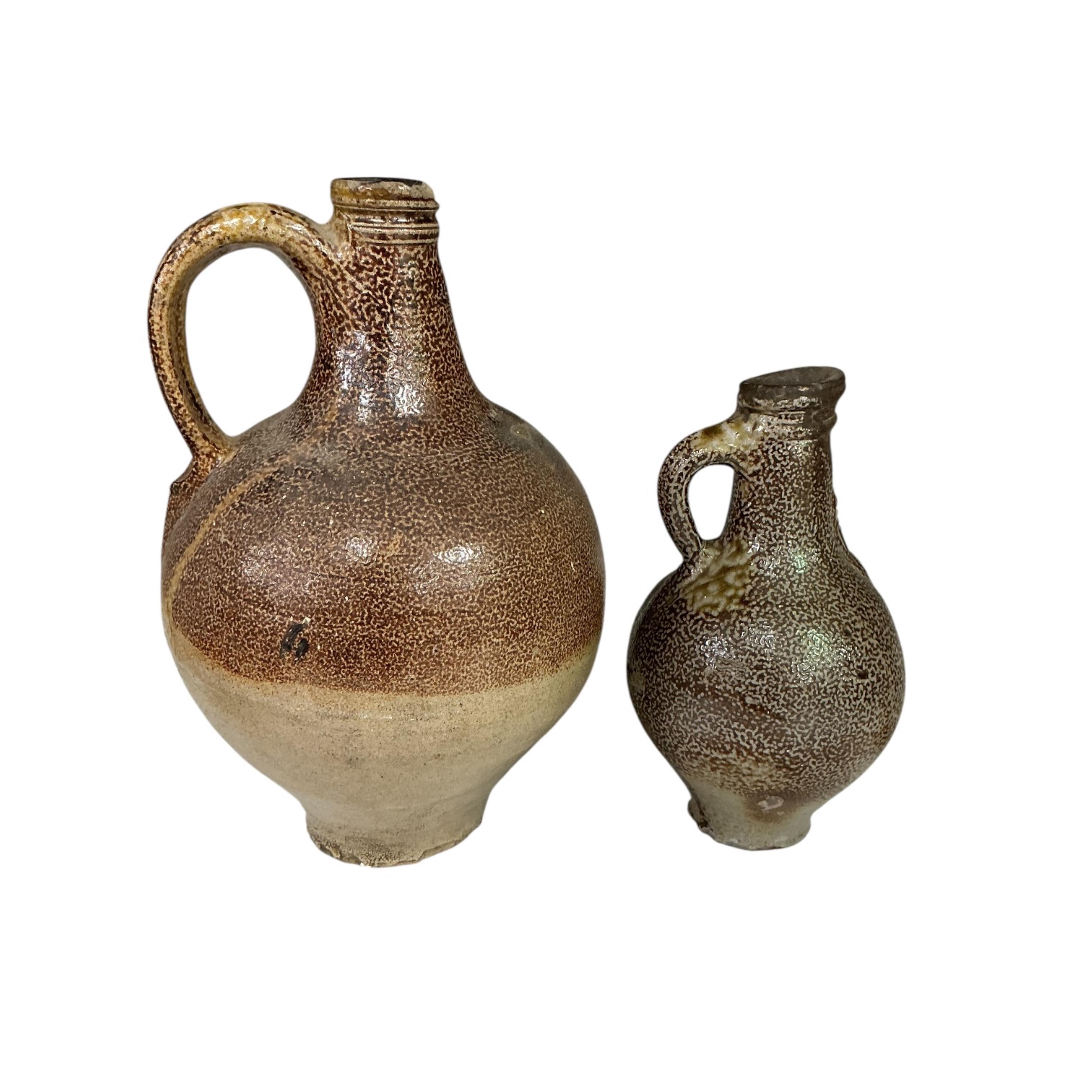 A 17th / 18th century bellarmine tigerware jug and another salt glazed jug, largest 32cm high