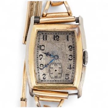Lot 2905 , A 1930's Swiss 18ct gold manual wind wrist watch, with tonneau shaped case and Arabic dial with subsidiary seconds, on a gilt metal bracelet, (a.f.).