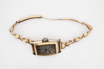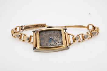 A 1930's Swiss 18ct gold manual wind wrist watch, with tonneau shaped case and Arabic dial with subsidiary seconds, on a gilt metal bracelet, (a.f.).