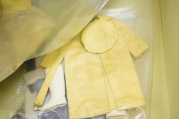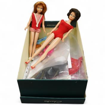 A 1960's Mattel Inc. Barbie doll, 1963, together with a Skipper doll, and a collection of eight original outfits with accessories, sorted into individual packets, outfits purchased between 1963 to 1966 include; American Airlines stewardess, Solo in the Spotlight, Career Girl, Red Flare, Sophisticated Lady, Swingin’ Easy, also two outfits for the Skipper Doll, plus a Barbie and Ken catalogue