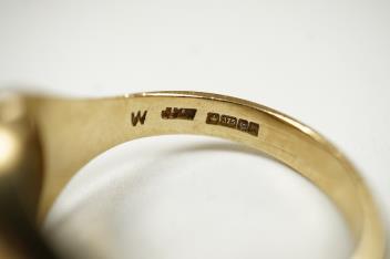 A 1980's 9ct gold and enamel oval masonic ring, size W, gross weight 8.1 grams.