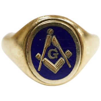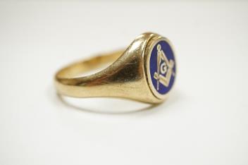 Lot 905 , A 1980's 9ct gold and enamel oval masonic ring, size W, gross weight 8.1 grams.