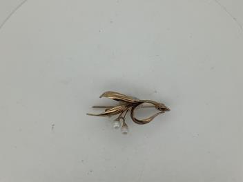 Lot 909 , A 1980's 9ct gold and two stone cultured pearl set foliate brooch, 35mm, gross weight 2.6 grams.