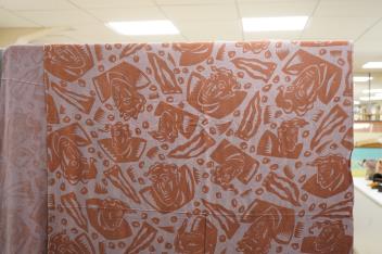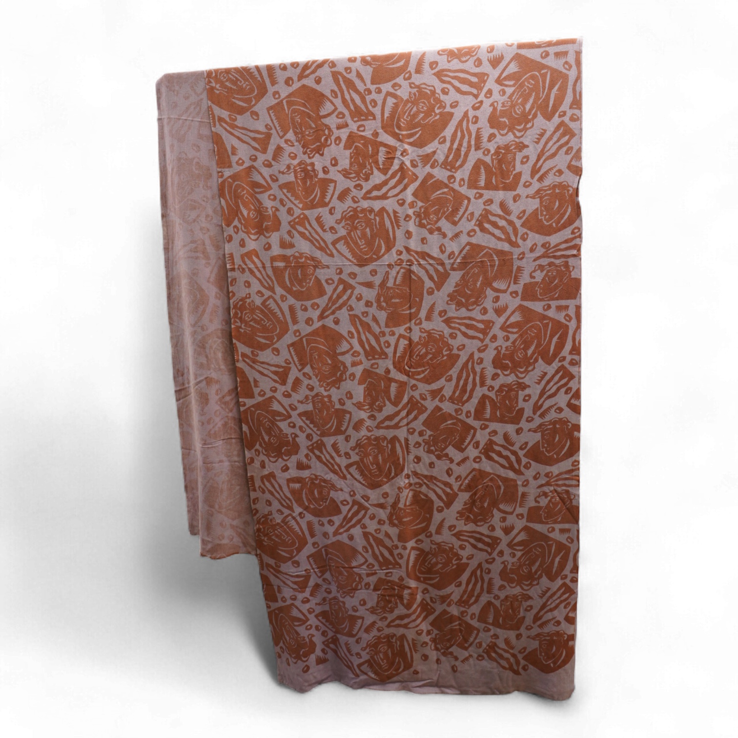 Lot 322 , A 1983 A brown mauve paper cut hand printed length of raw silk, designed by Paul Waring, (ex RCA 1983 Syds). 92cm wide x 480cm long. Condition- good, may need dry cleaning.