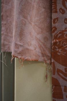 A 1983 A brown mauve paper cut hand printed length of raw silk, designed by Paul Waring, (ex RCA 1983 Syds). 92cm wide x 480cm long. Condition- good, may need dry cleaning.