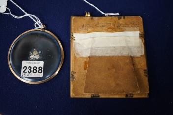Lot 702 , A 19th century, Italian portrait miniature of a lady with flowers, oval watercolour on ivory, indistinctly signed Biagiotti?, housed in an easel frame, together with another, housed in an inlaid and yellow metal pendant
