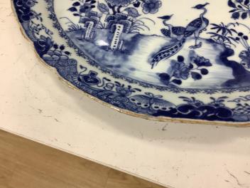 Serving dish series of light chips around rim, largest approx. 8x2mm, image 3; yellow enamel around rim worn. Smaller circular dish with attached plate hanger; crack inward from rim, reaching cavetto, preventing any sonorous ring tone, image 4. Both saucers badly chipped and cracked full-width and currently supported by tape.