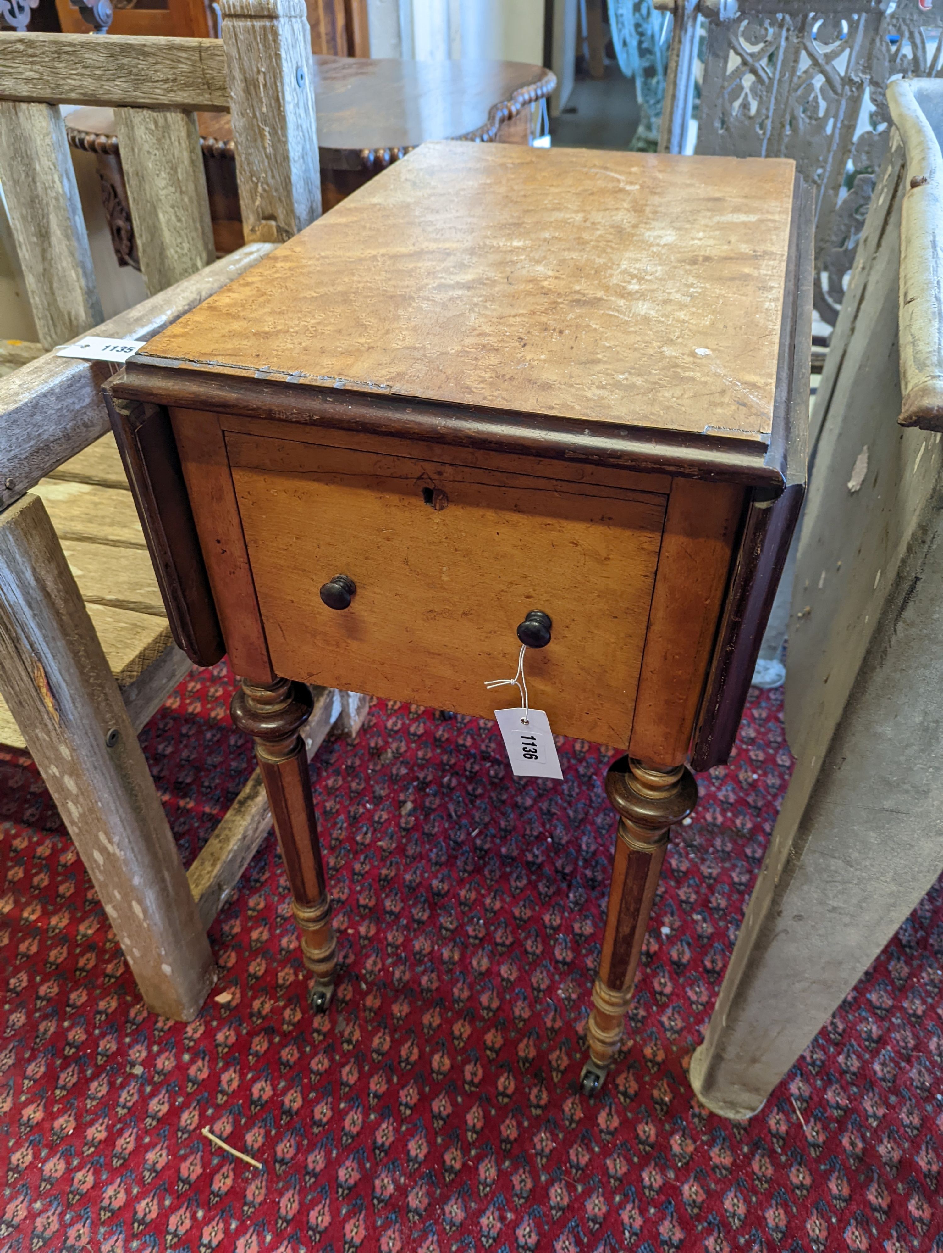 Lot 1159 , A 19th century Continental bird's eye maple drop flap work table, width 38cm, depth 53cm, height 74cm