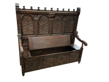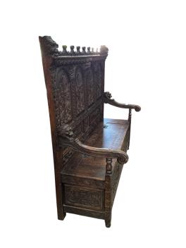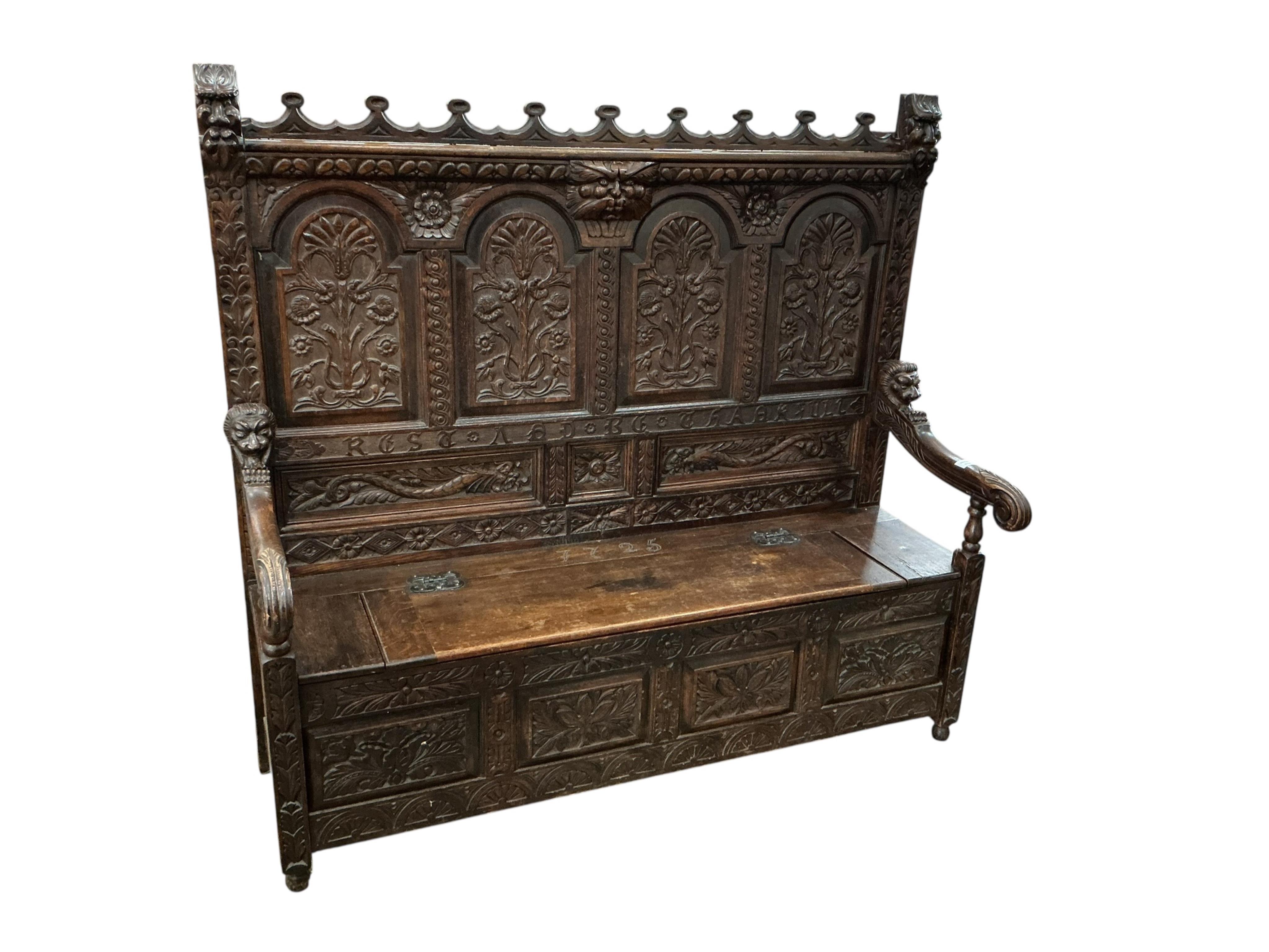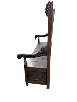 Lot 1032 , A 19th century Flemish carved oak settle, width 156cm, depth 58cm, height 145cm
