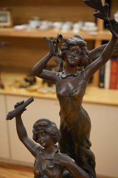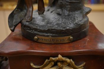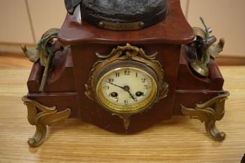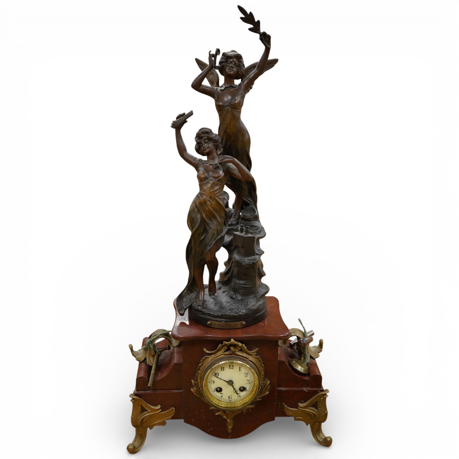 Lot 281 , A 19th century French mantel clock, rouge marble base, spelter figure with engraved 'Merveilles Du Siecle' plaque to front, height 74cm.