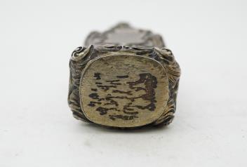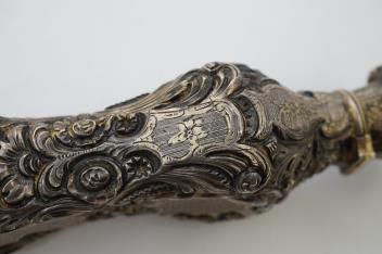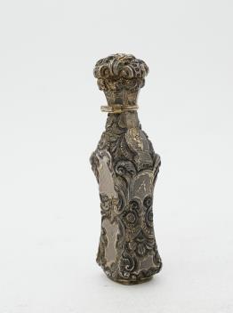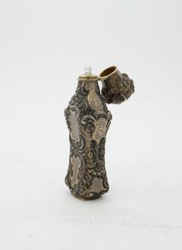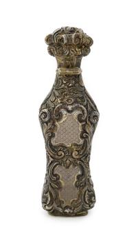 Lot 49 , A 19th century French ornate parcel gilt white metal scent flask, with hinged cover and glass stopper