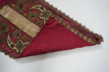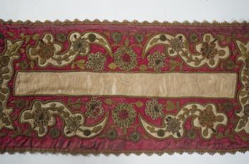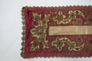 A 19th century Indian red and cream silk runner, heavily embroidered with scrolling motifs, using a variety of stump work and gold wire work stitches, with earlier Mughal influences, 118cm x 46.5cm (not including braid), backing cotton added later. Condition - both red and cream silk fragile. The gold embroidery is tarnished but strong.