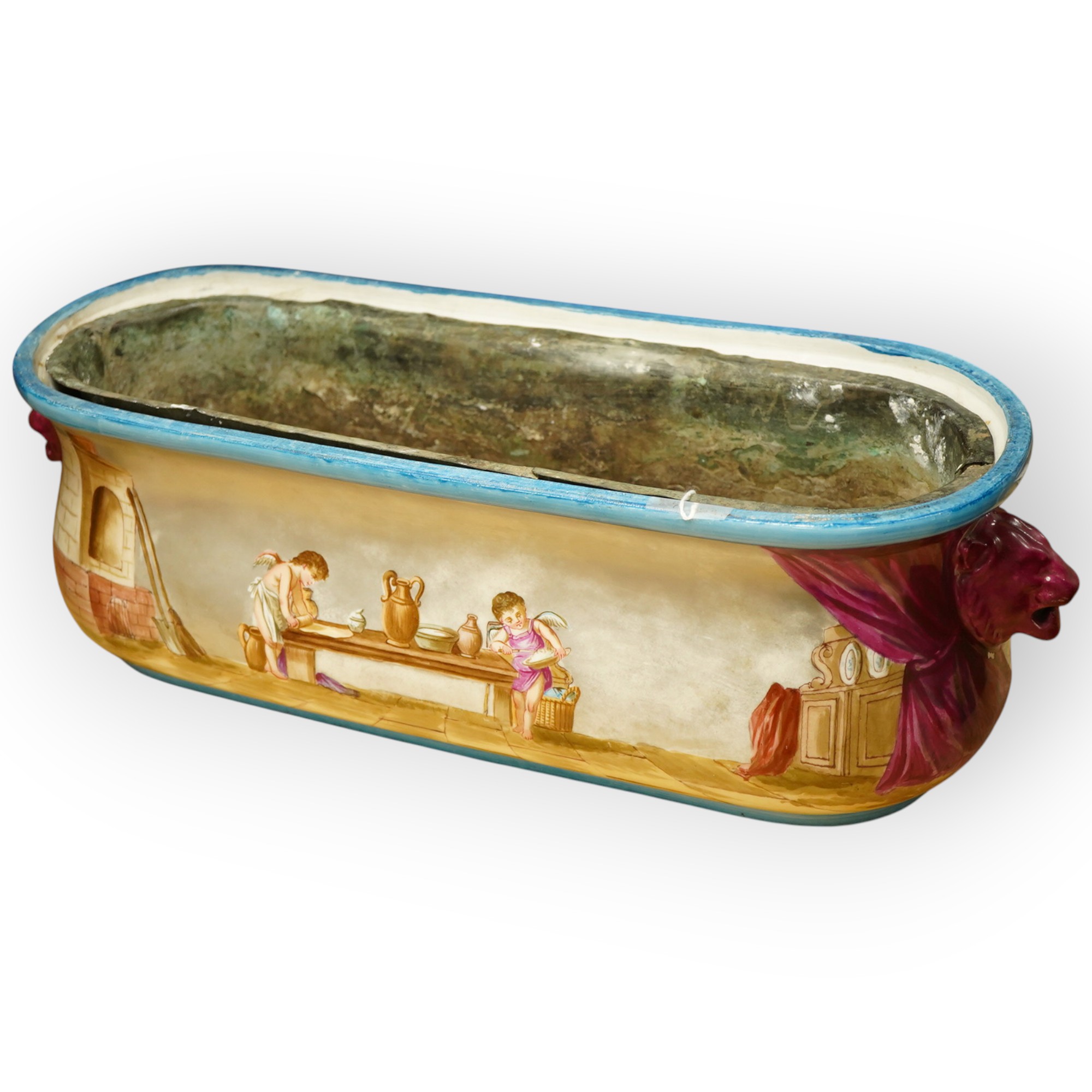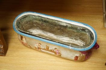 A 19th century Paris porcelain planter, hand painted with a wine making scene and kitchen scene, with lead liner, 55cm wide