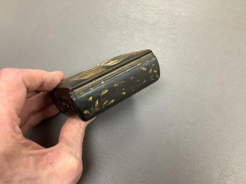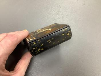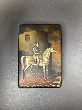 Lot 414 , A 19th century Russian lacquered papier mache snuff box, cover depicting Napoleon, inscribed ‘Le 2 Septembre, 1812…’, 9cm wide