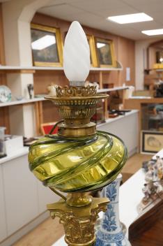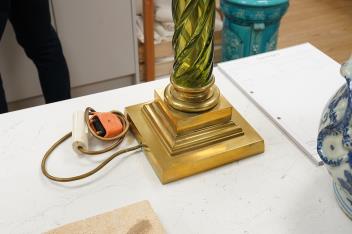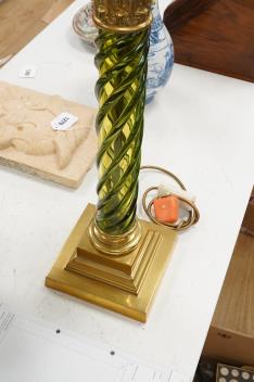 Lot 1280 , A 19th century gilt and brass green glass corinthian columned oil lamp by Messenger, 68cm high