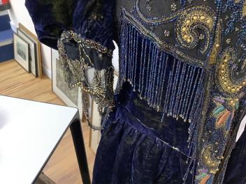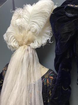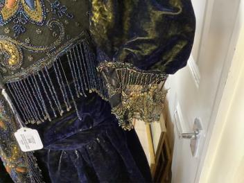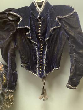 A 19th century ladies silk velvet matching long sleeved jacket/bodice, and skirt, together with another matching short sleeved bead worked bodice and white feather headdress.(4). Cape 106cm long. Condition - Both bodices have had beading added later, possibly converted as theatre costumes. The cape may have originally been the skirt to the bodices. The velvet is worn in places as expected for age and use.