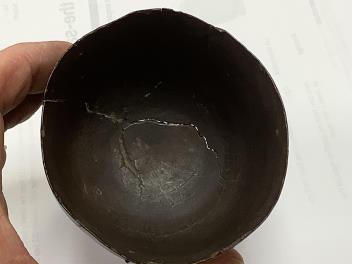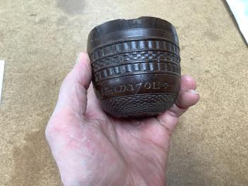 Lot 1477 , A 19th century or earlier engine-turned lignum vitae tumbler cup, engraved ‘Presented to M. S. Jones by a Friend 1843 AD 1701 +’, 6.5cm high, by repute found on the roof plate of Kenwood house London in 2012, during reno
