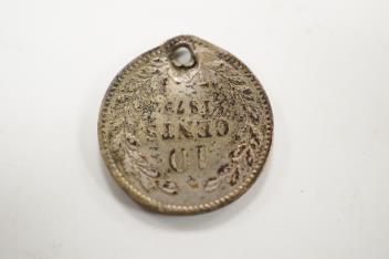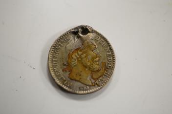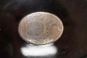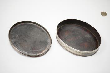 Lot 835 , A 19th century white metal mounted tortoiseshell oval snuff box, with inset oval white metal plaque engraved with family crest, unmarked, 10.1cm.