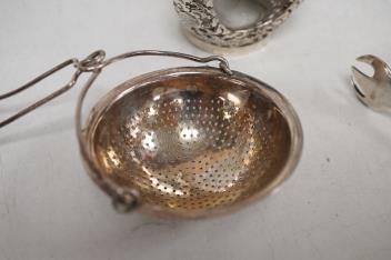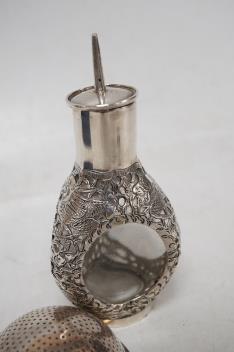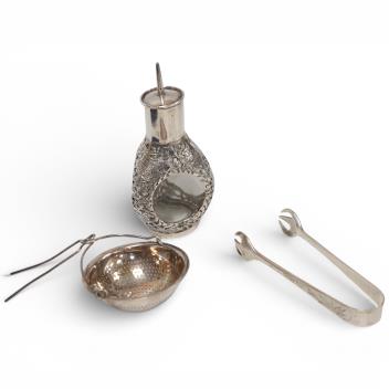 Lot 1836 , A 20th century Chinese pierced white metal mounted dimpled glass condiment bottle, height 11cm, together with a pair of Chinese sterling sugar tongs by Tack Hing and a Christofle plated tea strainer.