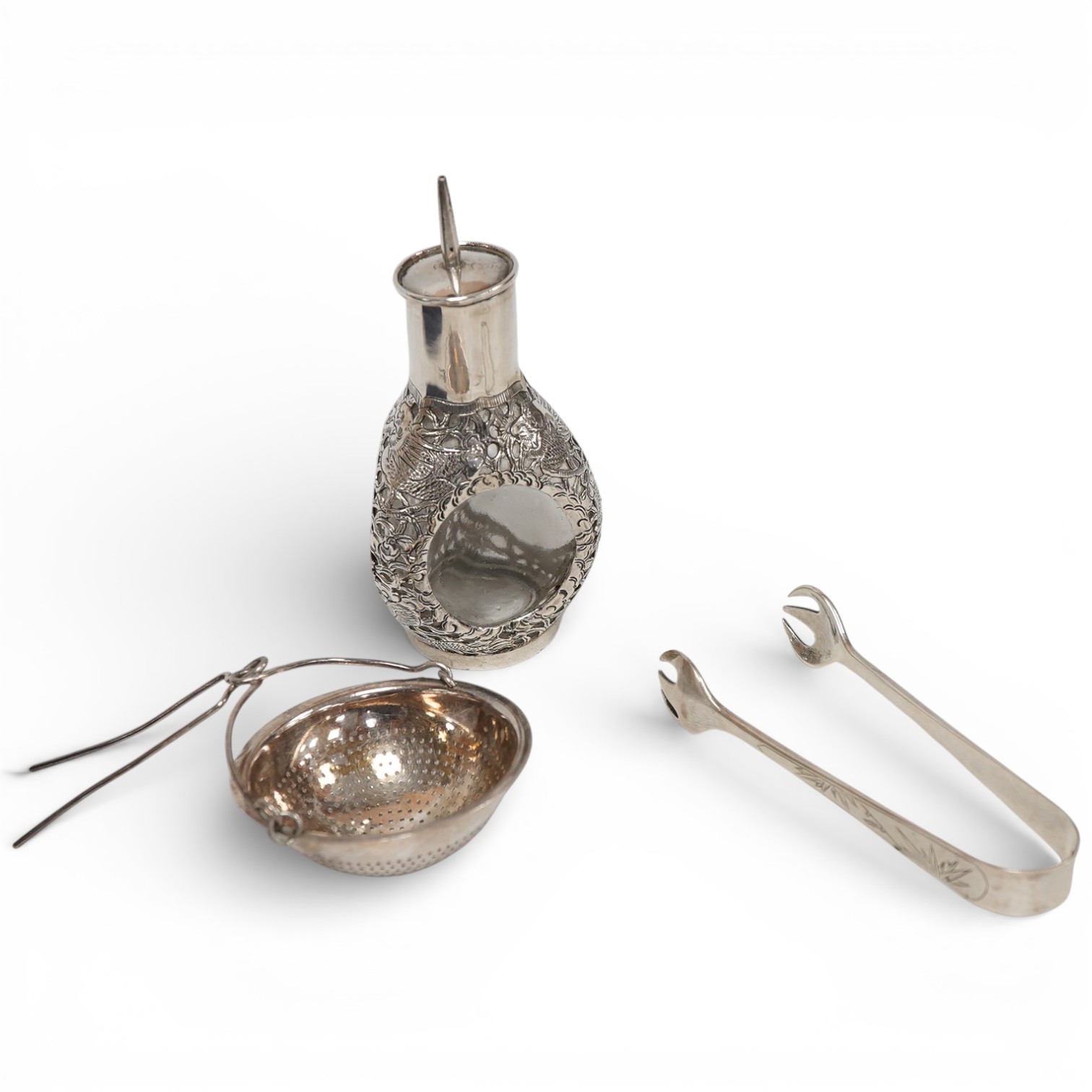 A 20th century Chinese pierced white metal mounted dimpled glass condiment bottle, height 11cm, together with a pair of Chinese sterling sugar tongs by Tack Hing and a Christofle plated tea strainer.