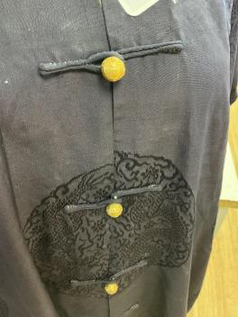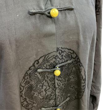 A 20th century Chinese silk damask robe designed woven dragon roundels and turquoise silk lining. Approximately 117cm long from nape of neck.