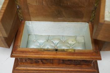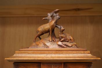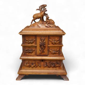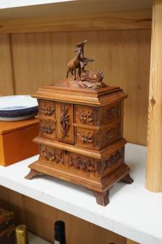 Lot 1435 , A 20th century black forest carved wood jewellery box, surmounted with two deer, 28cm high