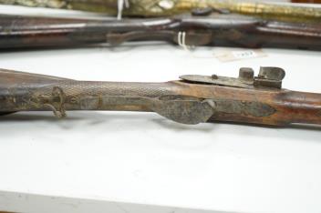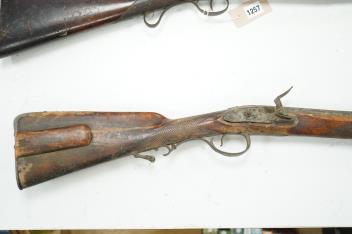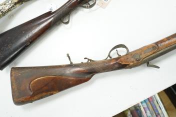 Lot 1258 , A 32 bore Continental flintlock rifle, unsigned lock, (cock missing) iron mounts and fully stocked, chequered small, sliding patch box cover, (ramrod missing)
