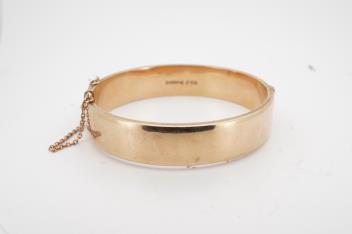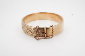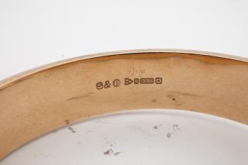 Lot 2947 , A 9ct gold bangle, of hinged construction, the front engraved with floral scrollwork, inner circumference approximately 17.7cm, British hallmarks, gross weight approximately 16 grams