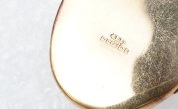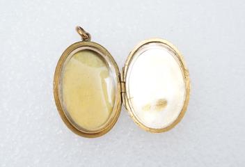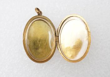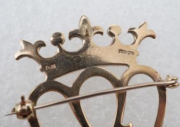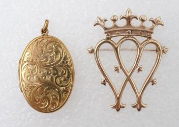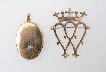 Lot 2916 , A 9ct gold brooch and locket, the brooch designed as a conjoined pair of hearts beneath a crown, length 4.7cm; the locket of oval outline, engraved to the front with foliate scrolls, length 4.2cm, each with British hallm