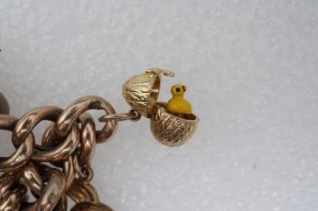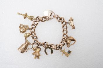 A 9ct gold charm bracelet, of curb linking, suspending nine charms including: a ballerina; a goldfish; an egg opening to reveal a chick in yellow enamel; a jug; an elephant on its hind legs; a horseshoe; a windmill on an enamelled meadow with a man and wife; a bridled horse's head; and a car, to a heart-shaped padlock clasp, sponsor's mark, charms and chain each with British hallmarks for 9ct gold, combined gross weight approximately 48 grams