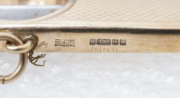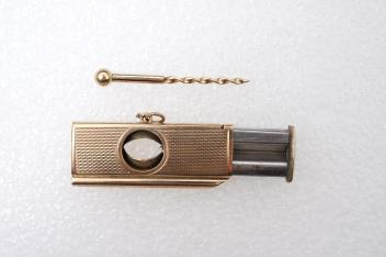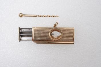 Lot 2976 , A 9ct gold cigar cutter, circa 1971, with engine turned decoration and corkscrew pin, length 5.7cm, British hallmarks, gross weight approximately 15 grams