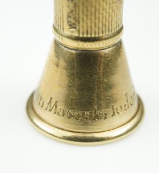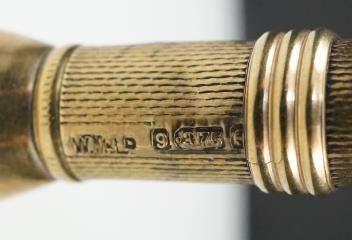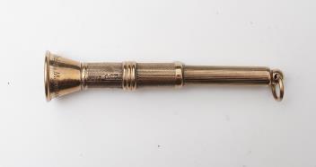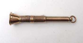 A 9ct gold cigar piercer, mid 20th century, of flared design, the piercer operated by pushing the top down, inscribed 'Maccabi Iodack Solomons May 1955 Dublin', length 7.4cm, British hallmarks, gross weight approximately 8.5 grams