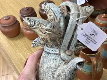 Lot 263 , A Blandine Anderson studio ceramic sculpture, fish in a kettle, 20cm