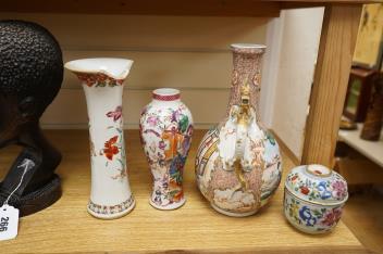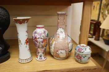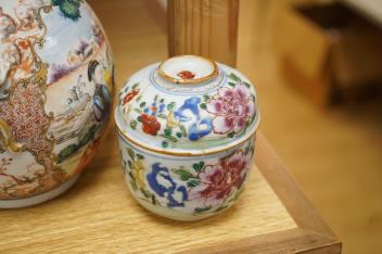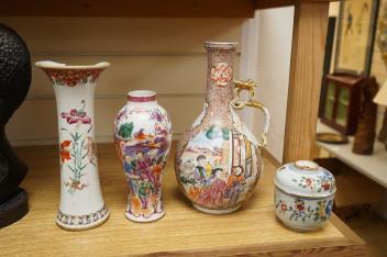 Lot 267 , A Chinese Mandarin pattern dragon handled jug, 26cm high, two famille rose vases and a pot and cover, all Qianlong period