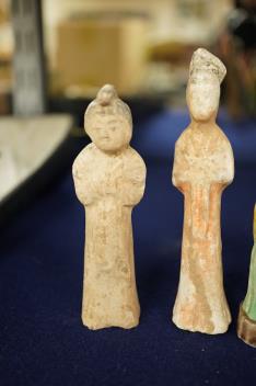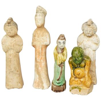 Lot 2481 , A Chinese Ming sancai small figure, three miniature pottery figures of ladies, Tang dynasty or later, and a sancai glazed figure (5)