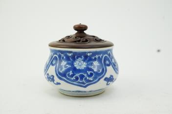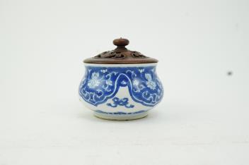 A Chinese blue and white baluster censer, Kangxi period, painted with lotus sprigs to lotus petal shaped reserves, ‘ Johanneum’ mark to base N:349 ~ , 11.3cm diameter, ruyi head pierced hongmu cover