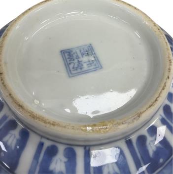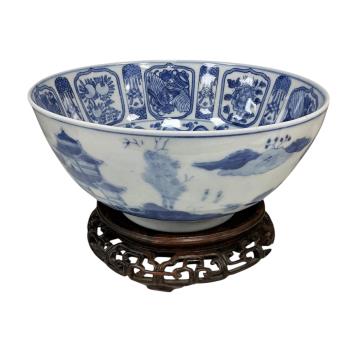 Lot 1422 , A Chinese blue and white bowl decorated with pagodas, together with an associated hongmu stand, bowl 31cm in diameter