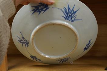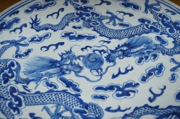 Lot 285 , A Chinese blue and white charger decorated with dragons chasing the flaming pearl, 38cm in diameter
