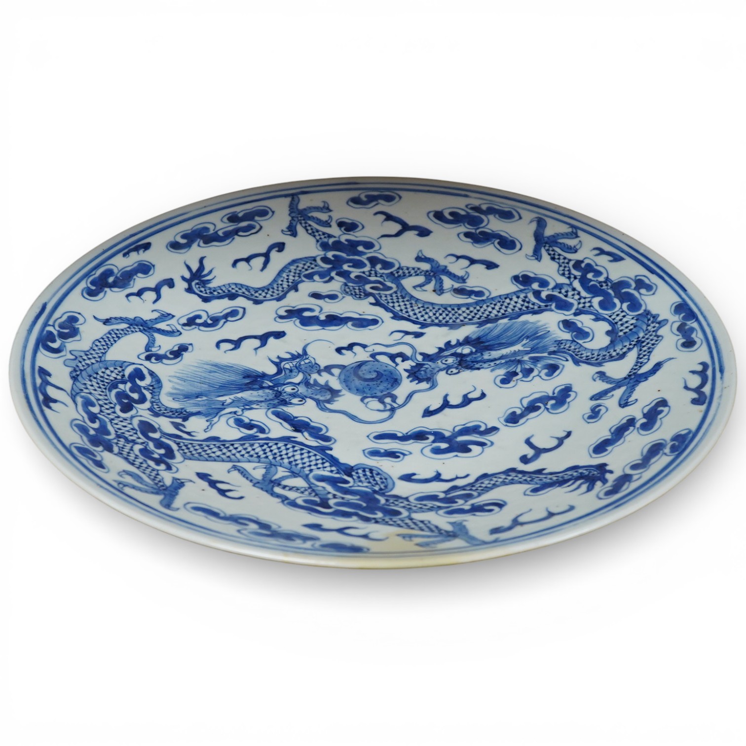 A Chinese blue and white charger decorated with dragons chasing the flaming pearl, 38cm in diameter