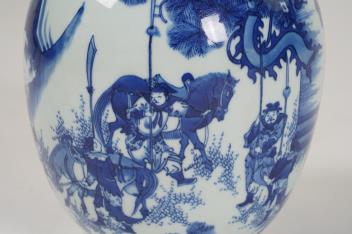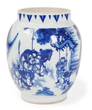 A Chinese blue and white lantern shaped vase, probably Chongzhen period, painted with a continuous moonlit landscape scene depicting General Han Xin on horseback, fleeing General Xiao and his men, incised border bands, 23.5cm high